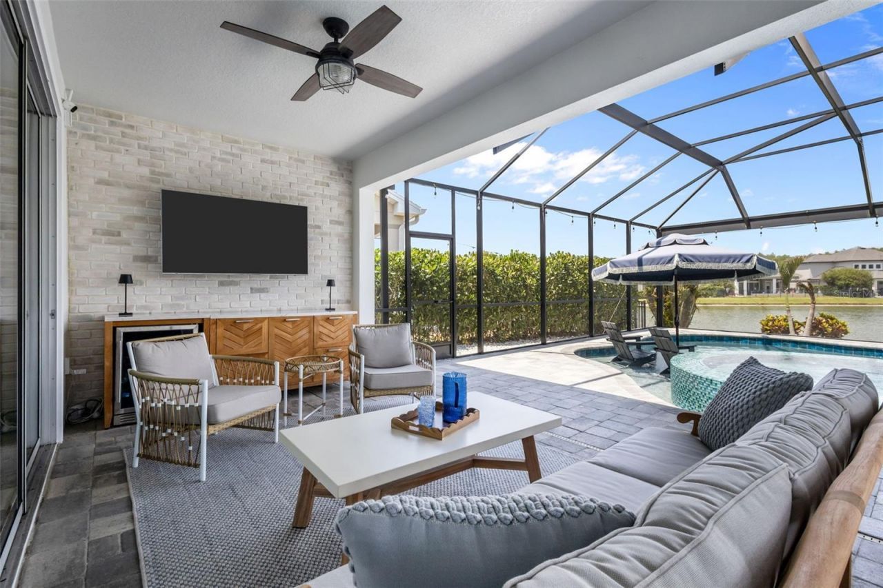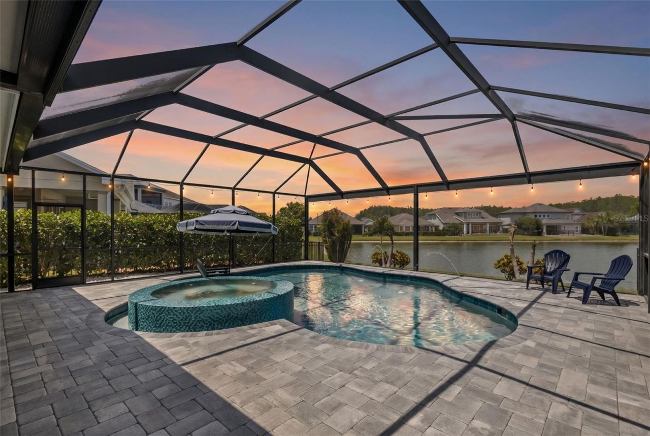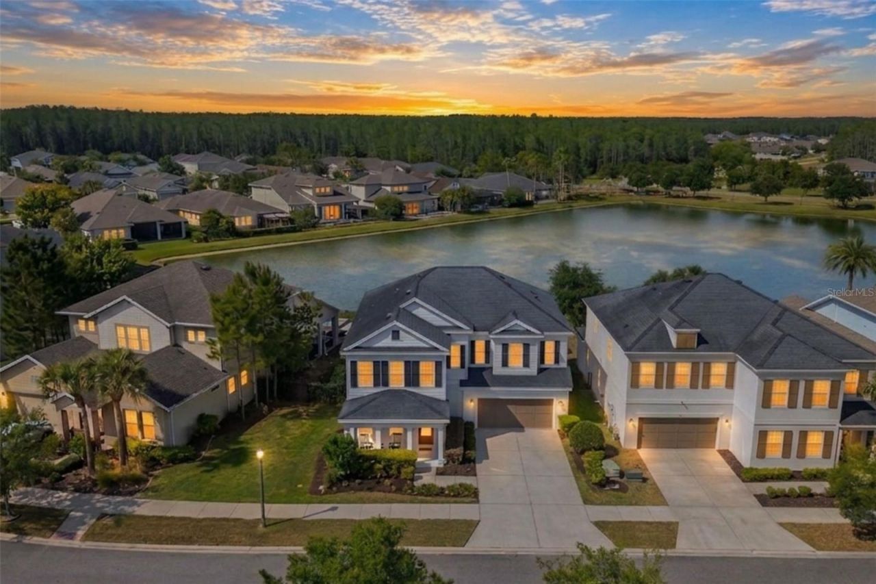 Welcome to your dream home in the Asturia community, featuring pond frontage, a screened lanai, and a gas-heated pool with infinity-edge spa. This traditional-style home offers a white exterior, black shutters, and a covered front porch, combining classic curb appeal with functional design.Inside, the foyer entry includes shiplap wall detailing, crown molding, and natural light, with a dedicated home office located just off the entry. The shiplap continues through the main hallway, leading to a mudroom with built-in storage cabinetry and designer tile flooring. A half bath with quartz countertops is also located on the main level. A formal dining room with wainscoting and chandelier connects to the open-concept kitchen and living area.The living room features two-story ceilings, a floor-to-ceiling fireplace, and built-in cabinetry. The kitchen was updated in 2022 and includes quartz countertops, a custom backsplash, gold hardware, pendant lighting, and under-cabinet lighting. Additional interior features include engineered wood flooring throughout the main level, plantation shutters on all windows, and detailed wood trim around windows and door frames.The outdoor living space includes a screened lanai with a gas-heated pool, infinity-edge spa, sunshelf with umbrellas, and water features, all overlooking a pond. The covered outdoor area includes a brick accent wall and space for seating and dining. The property also includes tropical landscaping and a fenced side yard.Upstairs, the primary suite includes crown molding, natural light, and a built-in window seat with storage. The en-suite primary bathroom features marble countertops, dual sinks, and a walk-in shower with dual showerheads. All bedrooms include walk-in closets with built-in cabinetry. A secondary bathroom includes quartz countertops and a tub/shower combination. The laundry room with sink is located near the primary suite.Additional features include a 3-car tandem garage with built-in storage shelving. Located steps away from the Asturia amenities including a clubhouse, fitness center, community pool, dog park, playground, and trail system. Convenient access to SR 54 and the Suncoast Parkway provides connectivity to the Tampa area.