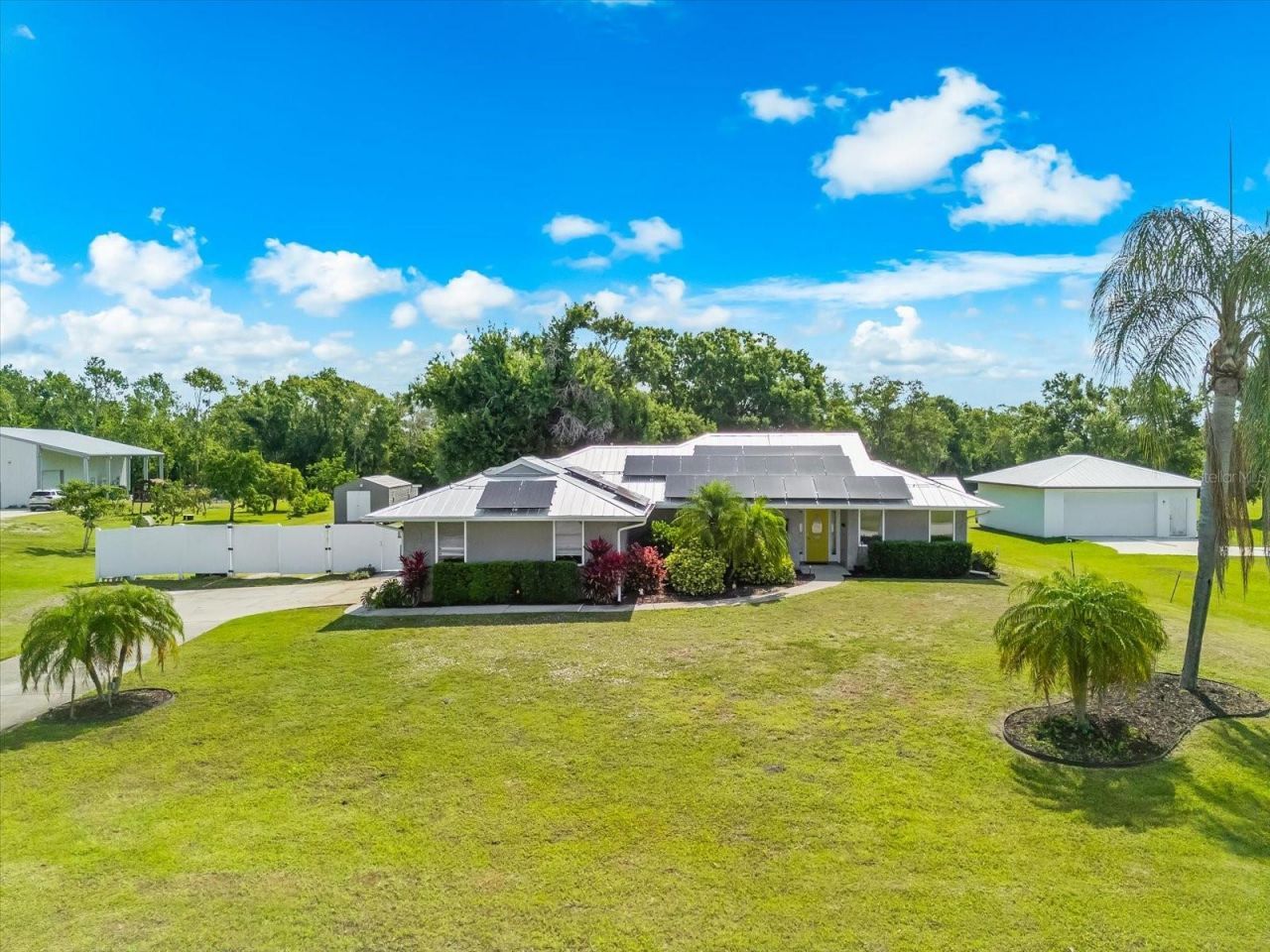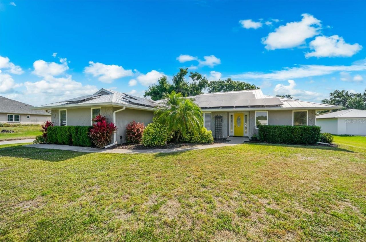 One or more photo(s) has been virtually staged. Located in Racimo Ranches, this unique property sits on an acre of land with no deed restrictions, offering both privacy and flexibility. This 3-bedroom, 2-bath residence with a 2-car garage welcomes you through a foyer entry that opens into a spacious, light-filled living area complete with skylights and a cozy wood-burning fireplace. The dining area is highlighted by a bay window and a custom-built-in hutch, creating a warm and inviting space for gatherings. The kitchen features quartz countertops, a tiled backsplash, mostly stainless steel appliances, a pantry, and a convenient breakfast bar. A versatile office or flex space with French doors to the exterior provides the option for a home office or playroom. The primary suite offers direct outdoor access, a generous built-in closet, and a private bath with dual sinks, quartz countertops, a whirlpool tub, and a walk-in shower with a rain shower head. One guest bedroom also opens to the peaceful koi pond area, while the third bedroom includes a built-in closet. The guest bathroom features dual sinks, quartz counters, and a tub/shower combination. Interior finishes include ceramic tile throughout the main living areas, laminate flooring in the primary bedroom, and carpet in the guest bedroom. The garage includes a laundry area and convenient side access. The outdoor living space is truly exceptional, featuring a custom pergola lanai with brick pavers and artificial turf, complete with planters, a ceiling fan, an outdoor shower, a dining area, custom swings, and a tranquil koi pond. The grounds are professionally landscaped with lighting and irrigation, and include a playground, a custom sandbox, a garden area, an additional pond, and a shed with electric service and separate storage. Recent updates include a 2022 roof and a 2016 A/C system, along with a solar panel loan that transfers to the new owner. Conveniently located near Tatum Ridge Golf Links and is just minutes from I-75 and close to shopping, dining, and recreation, including Nathan Benderson Park, UTC Mall, and Mote Marine Laboratory & Aquarium. Plus, you're only about 25 minutes from the world-renowned Siesta Key Beach. Offering space, character, and a prime location, this property is a rare opportunity to enjoy the best of Florida living. COMPLETED ARCHITECTURAL PLANS ARE AVAILABLE TO CONVERT HOME INTO A 4 OR 5 BEDROOM WITH 3 BATHS.