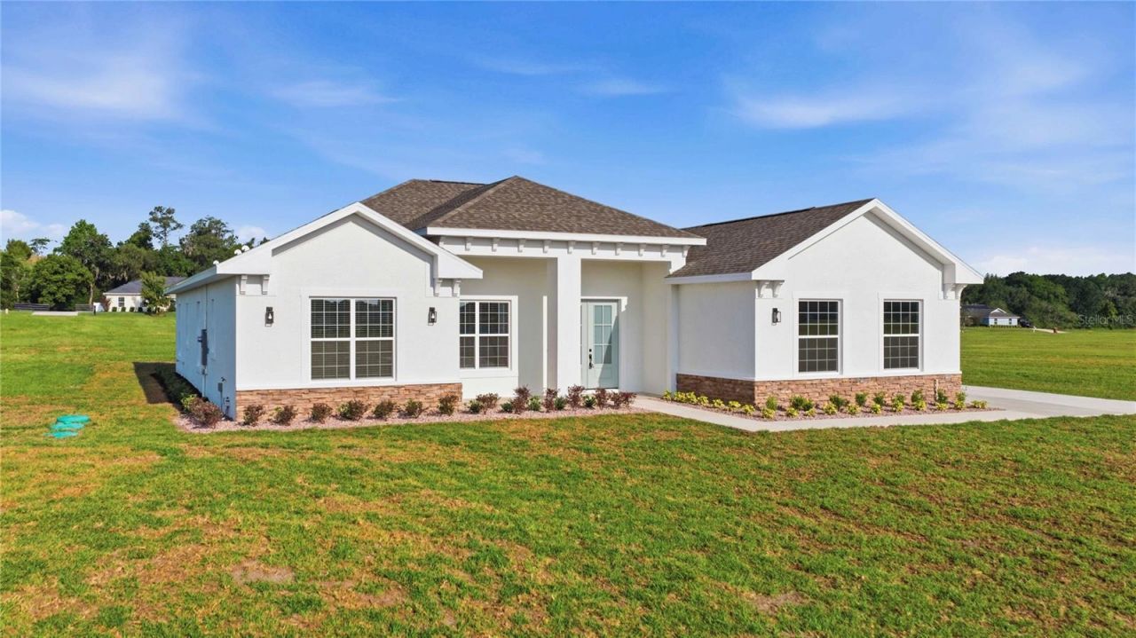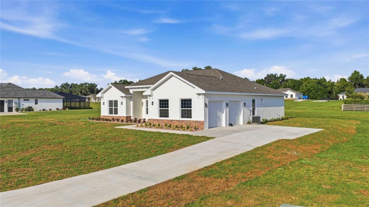Welcome to Irish Acres in Ocala, Florida-where custom design meets everyday comfort. This stunning 4-bedroom, 3-bath home also features a versatile flex room, spacious indoor laundry, and an oversized garage.The kitchen truly steals the show, showcasing crisp, clean lines, under-cabinet lighting, soft-close cabinetry, a double oven, wine fridge, and an expansive island with additional seating-perfect for gathering and entertaining.Designed with a triple-split floor plan and open-concept layout, this home is ideal for both privacy and hosting. Soaring 10-foot ceilings throughout and a dramatic 16-foot vaulted ceiling in the living room create a bright, airy feel, beautifully complemented by elegant crown molding. (Some photos have been digitally enhanced or staged)No detail was overlooked-from the 10-inch ceramic wood-look tile flooring to the 7.25-inch baseboards throughout. Enjoy relaxing mornings and peaceful evenings on the covered front and back porches.Located in a quiet, luxury gated community, this home offers both tranquility and convenience-just minutes from everything Ocala has to offer.