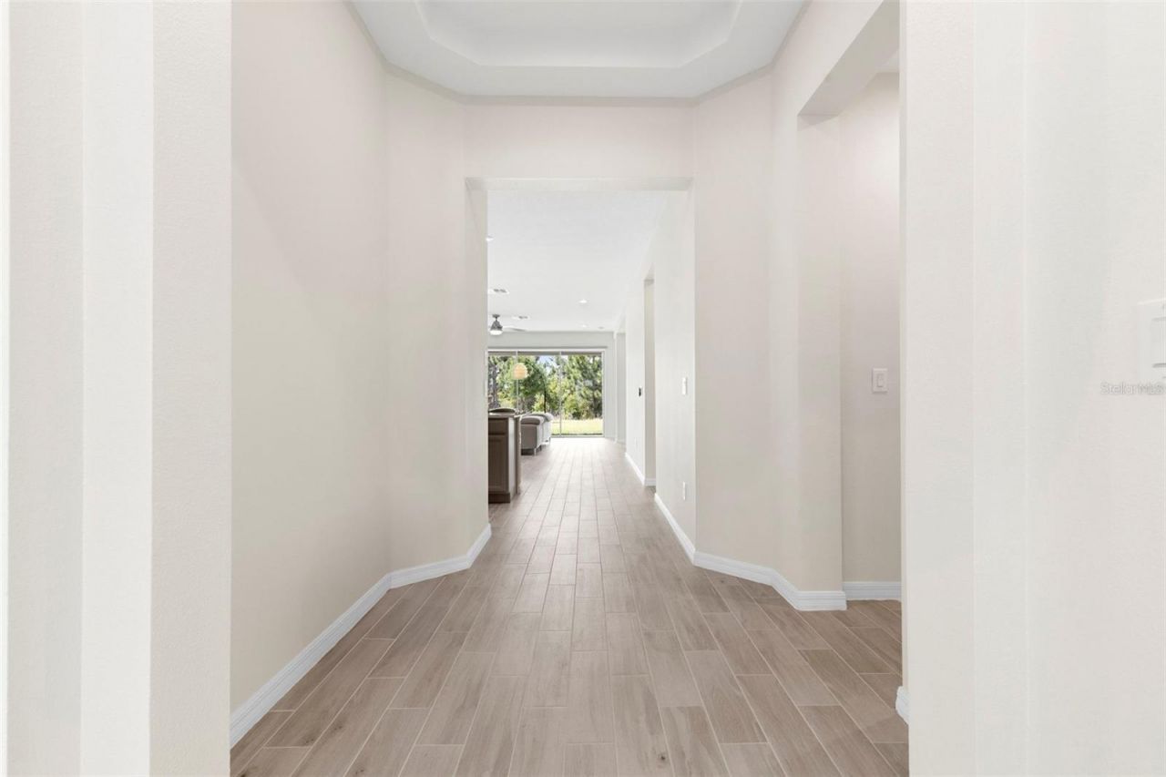 One or more photo(s) has been virtually staged. Positioned within the sought-after community of River Landing and set against a peaceful wooded backdrop, this original-owner 2022 Taylor Morrison residence offers a seamless blend of contemporary design, comfort, and elevated everyday living in one of Wesley Chapel's prime locations. Thoughtfully designed with 2,420 square feet of single-story living, this four-bedroom, three-bath home with a versatile bonus room and two-car garage balances style with functionality, all while being ideally situated near the community gate, resort-style amenities, premier shopping, dining, and major roadways.Step through the covered entryway into a light-filled interior where natural light carries throughout the home, enhanced by 8-foot doors that add to the open, elevated feel. Just off the foyer, a spacious bedroom and full bath create a private retreat for guests, complete with a sleek glass walk-in shower and a Broan Surface Shield antiviral and antibacterial LED exhaust fan. Nearby, a flexible bonus room offers endless possibilities-ideal as a home office, formal dining space, or creative studio.Continue down the hall as the layout opens into the heart of the home, where open-concept living takes center stage. The gourmet kitchen is both striking and functional, featuring 42-inch wood cabinetry, quartz countertops, a designer tile backsplash, recessed and statement lighting, stainless steel appliances, and a gas range, along with an expansive island with wood planking detail. A dry bar and oversized walk-in pantry elevate the space, making entertaining effortless. The kitchen flows seamlessly into the dining and living areas, where pocket sliding glass doors blur the line between indoor and outdoor living.Privately tucked just off the living room, the primary suite offers a serene escape with a modern, tranquil feel, complemented by an expansive walk-in closet. The spa-inspired en-suite bath features a glass walk-in shower with bench seating, a soaking tub, dual-sink quartz vanity, and an additional Broan Surface Shield LED exhaust fan.Two additional bedrooms are thoughtfully positioned and share a beautifully designed full bath, completing the home's well-executed single-level layout.Through stacking glass sliders, the covered lanai opens to an expansive backyard overlooking peaceful wooded views, offering the perfect canvas for a future pool or outdoor kitchen.Additional highlights include a leak detection system with auto shutoff, security system, Nest thermostat, pre-wiring for surround sound, tankless water heater, whole-house water softener and filtration system, electric vehicle charging connection, epoxy-coated garage flooring, MyQ app-controlled garage door opener, and French drains.River Landing residents enjoy an exceptional lifestyle with a beautifully appointed clubhouse featuring recreational and fitness spaces, a game room, lagoon-style pool with splash area, hot tub, cabanas, ample lounging areas, pickleball and tennis courts, basketball courts, soccer fields, dog park, playground, and corn hole area-creating a true resort-style living experience. Ideally situated near The Shops at Wiregrass and Tampa Premium Outlets, the community offers both convenience and lifestyle, with easy access to I-75, SR 56, SR 581, and SR 54.