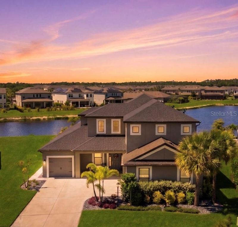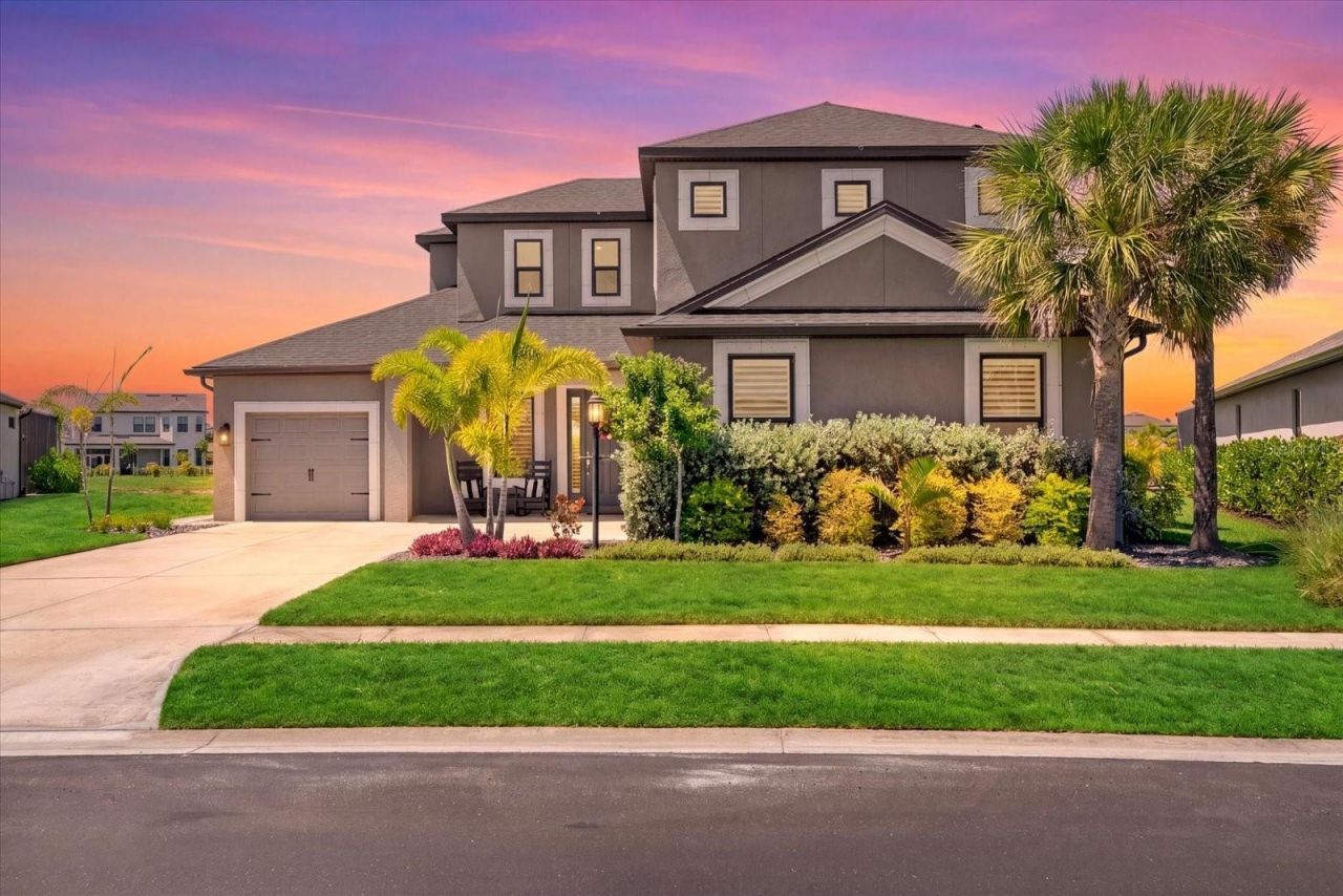 Located in Cassia at Skye Ranch, this 2023-built 5 bedroom, 4.5 bathroom 3-car garage home offers 3,519 sq ft with a first-floor primary suite on an oversized pie-shaped lot with wide lake views.Open-concept layout with a spacious great room featuring a custom fireplace wall, wood beam ceiling detail, tray ceilings, and crown molding. Pocket sliding glass doors open fully to the lanai for seamless indoor-outdoor living.Kitchen includes gas cooking, oversized island, quartz countertops, white cabinetry, stainless appliances, and ample seating.First-floor primary suite with wood beam ceiling detail, massive walk-in closet, dual vanities, soaking tub, and separate shower. Upstairs offers additional bedrooms, en-suite baths, and flexible living space.Screened lanai with saltwater heated pool and spa, upgraded panoramic screen enclosure, and extended paver walkway to the backyard with private lake views.Additional features include a custom built drop zone, plantation shutters, front porch, ceiling fans throughout, upgraded landscaping, large laundry room, and a 3-car garage with ample storage.Residents of Skye Ranch enjoy access to The Hub, a resort-style amenity center featuring a clubhouse, resort pool, lap pool, splash pad, kiddie pool, fitness center, movement studio, indoor basketball court, rock climbing wall, and social spaces including a caf?, demonstration kitchen, and game room. Outdoor amenities include pickleball, tennis, bocce ball, sand volleyball, and over 25 miles of trails and parks. Turner Park offers additional soccer and baseball fields, playgrounds, and open space. A K-8 school is located within the community.Future amenities include The Cove, planned to feature a lazy river, resort pool, and waterslide.Conveniently located just minutes to Waterside Place, UTC shopping and dining, downtown Sarasota, and Siesta Key beaches, with easy access to major roadways.
